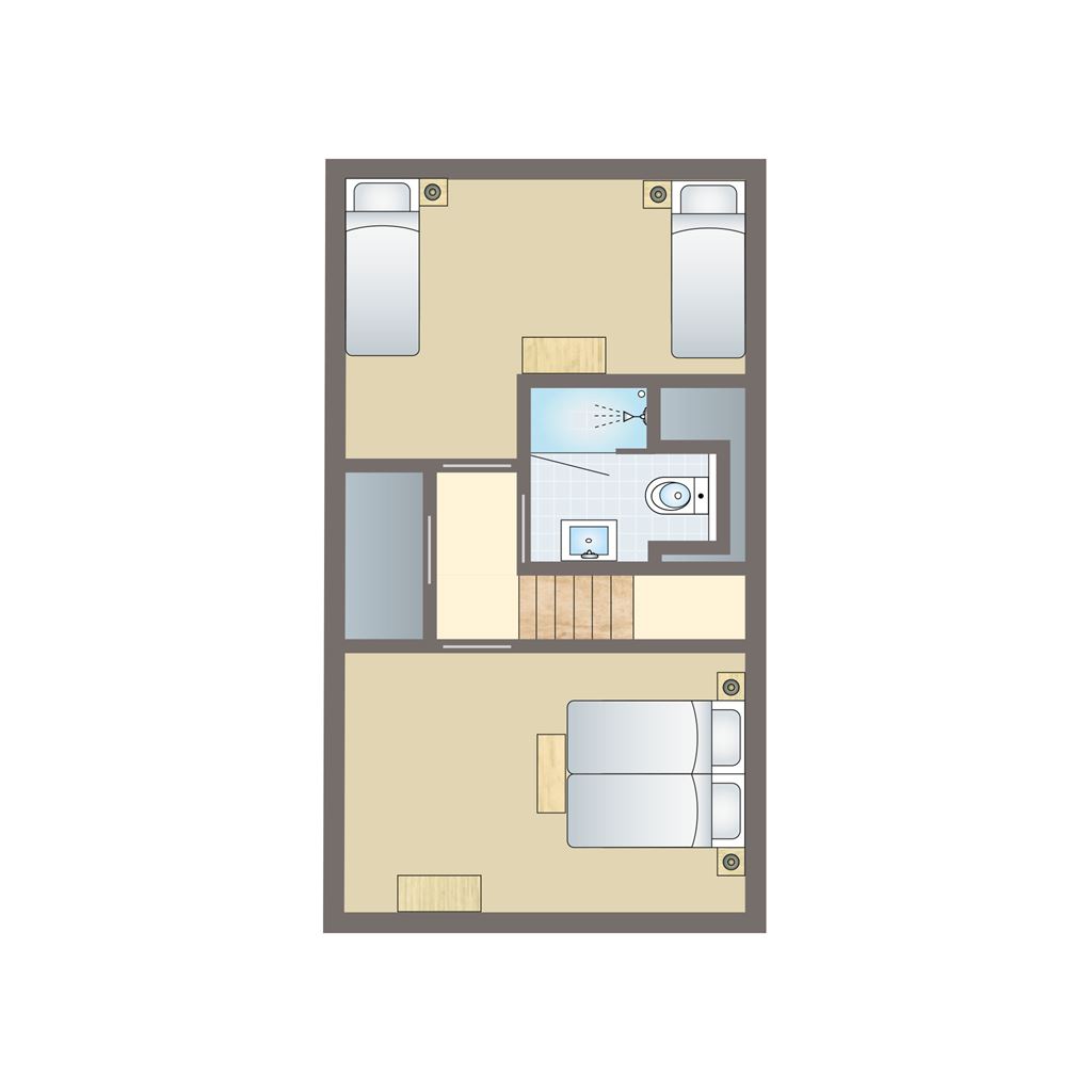 - Schlafzimmer mit zwei Boxspring-Einzelbetten, 2-Personen Softtopper und Flatscreen-TV auf der ersten Etage