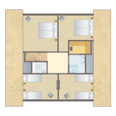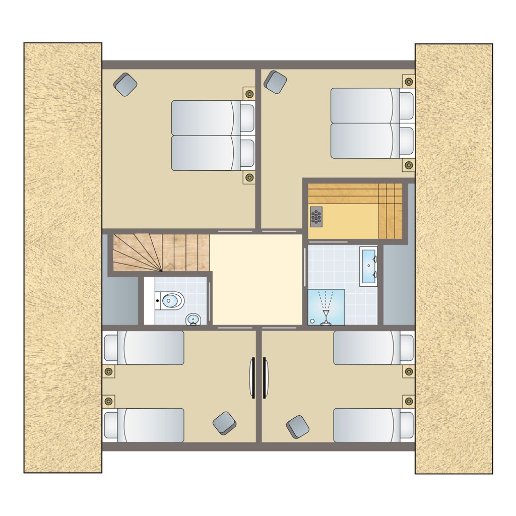 - Zwei Schlafzimmer mit jeweils zwei Boxspring-Einzelbetten auf der ersten Etage