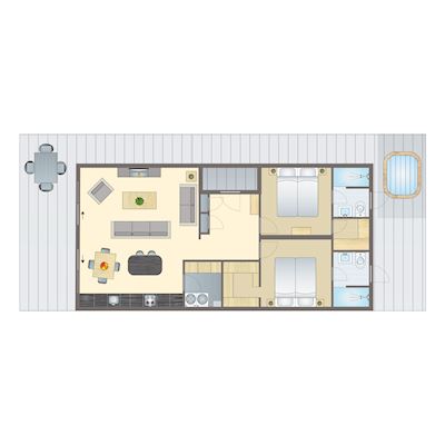 - Zwei Badezimmer (vom Schlafzimmer begehbar) mit ebenerdiger Dusche und WC