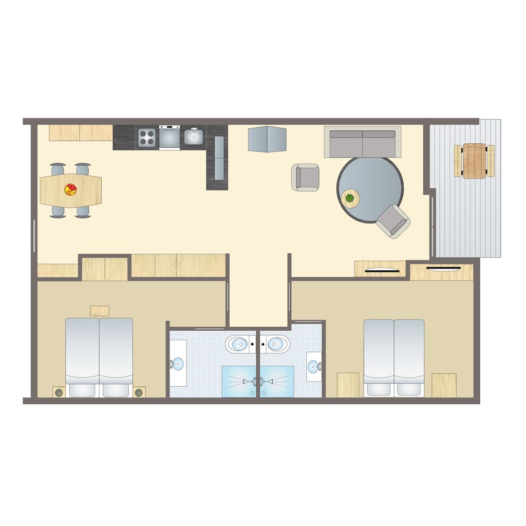 • Zwei Schlafzimmer mit jeweils einem Doppelbett