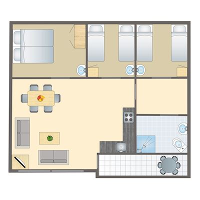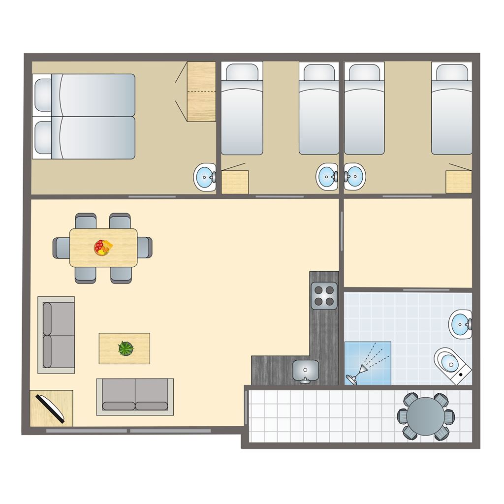 - Zwei Schlafzimmer mit jeweils zwei Boxspring-Einzelbetten und Waschbecken