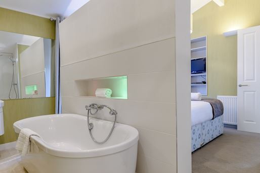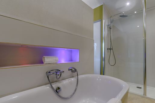 • Badezimmer (vom Schlafzimmer begehbar) mit Dusche, doppeltem Duschkopf und WC