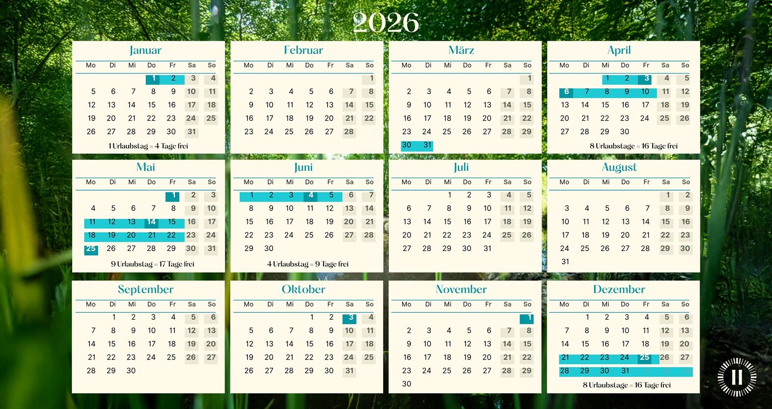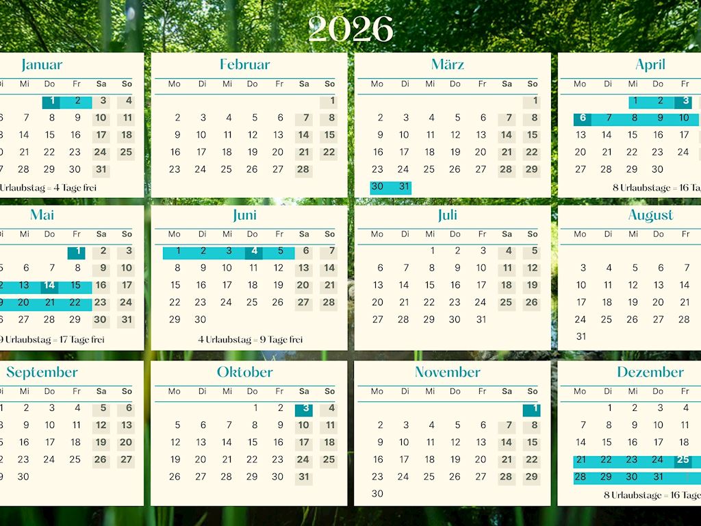 Mit unserem Urlaubsplaner holst Du das Meiste aus Deinen Urlaubstagen 2026 heraus. Nutze die Feier- und Brückentage, um Deinen Urlaub zu verlängern! Wir zeigen Dir, welche Brückentage es 2026 gibt und Du musst Dir nur noch den Urlaub einplanen.